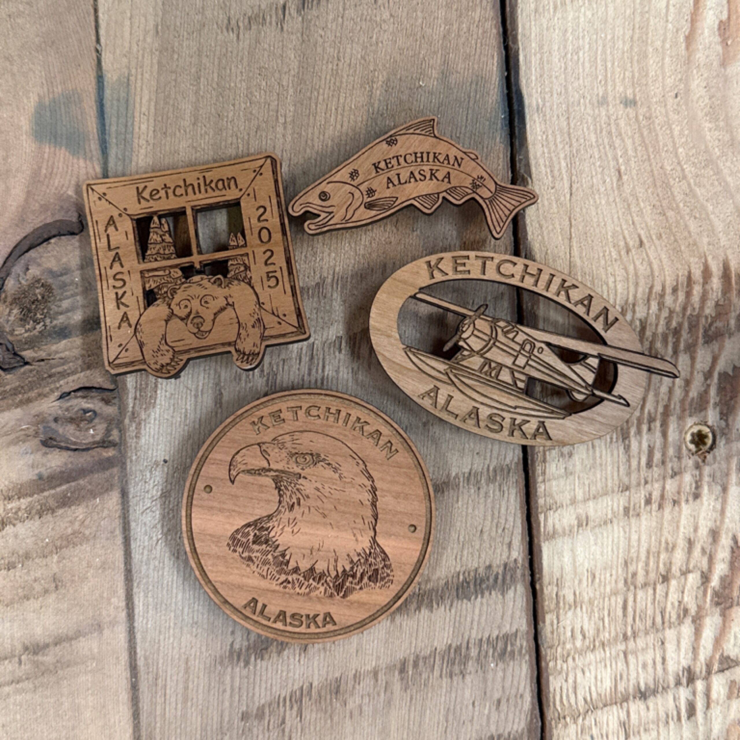 | Attribute | Blasphemous Bill's, Eagle Head, Loon, Wolf Head, Ketchikan Salmon – Small, World Class Ketchikan Salmon, Bear Head, Cartoon Bear In Window, Cartoon Moose In Window, Float Plane, Dragonfly, Sam McGee's, Bear With Fish, Alaska's State Bird – Mosquito, Flying Alaska – Float Plane |